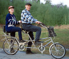 Идея такая: прицепить желтый трехколесник (фото слева) или трехколесник И.Баронаса и Г.Писарева к тандему (фото справа). Получим велотакси - 1 водитель и 3 пассажира. Каждый может крутить педали в свою силу. Такие велотакси и надо пустить по маршрутам в парках отдыха, ВВЦ (ВДНХ), Сокольники, парк Победы - М. Кутузовская и других аналогичных местах (где отсутствует автотранспорт). Если надо, то можно отсоединить и пользоваться отдельно. Очень удобно. |