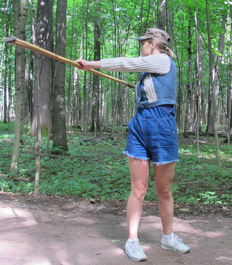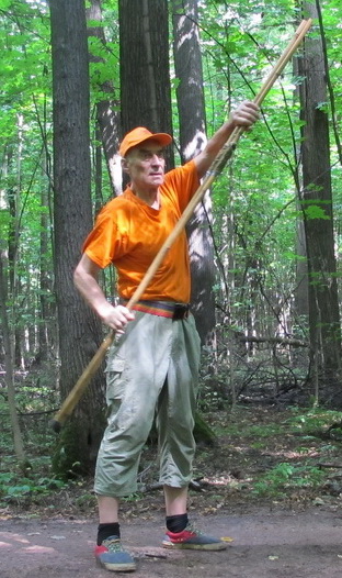 Ф.1. Ходить с лыжными палками я начал ещё в прошлом тысячелетии (ок. 1995). С бега на ходьбу перешёл, чтобы не стирать хрящи. В 2004 купил в Мюнхене (за евро) модные складные палки - см. Ф.3. В 2015 в Москве стали появляться модные кружки "Скандинавская ходьба). В 2016 прочёл "Энциклопедию Амосова Н.М.", в которой он говорит об ограничениях (в еде и удовольствиях) и нагрузках (физических организма, до повышения пульса). Я понял, что "скандинавская ходьбы" не очень нагружает, и решил сделать свои парки для нагрузок. Для начала разыскал бамбуеовые палки, надел резиновые наконечники, чтобы не цокали по асфальту. Сделал ручки (ф.3). Их вес был 200-250 г По Амосову это слабовато. Тогда я срезал в лесу палки. Тоже надел наконечник и сделал ручки. Сырые они весили 1,5 кг, когда высохли - около 1 кг. Походил с ними, мне понравилась нагрузка. На телефон мне скачали шагомер, увидел что я прохожу в Измайловском парке по 9-10 тыс. шагов. Суздальцев Геннадий Сергеевич заставил померить длину шага. Оказалось, что при такой ходьбе - это 95 см. Вырезанные палки хорошие, гладкие, но кривоватые. Пошёл в строймагазин, подобрал бруски-рейки 40х30 мм, строганные. Оказалось - в самый раз! Вес 1 кг (2 м на мой рост). Мне сделали надписи в подарок. Теперь хожу, рассекаю. Хорошая нагрузка на плечи. А когда подпрыгиваю, ухватившись за концы палок, то к нагрузке плечей и рук добавляется массаж внутренних органов (висцералки). В общем получилось - три в одном! Ф.2. С такими палками можно делать разные упражнения.
